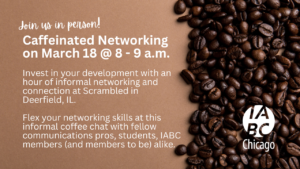 Invest in your development with an hour of informal networking and connection at Scrambled in Deerfield, IL. Flex your networking skills at this informal coffee chat with fellow communications pros, students, IABC members (and members to be) alike.